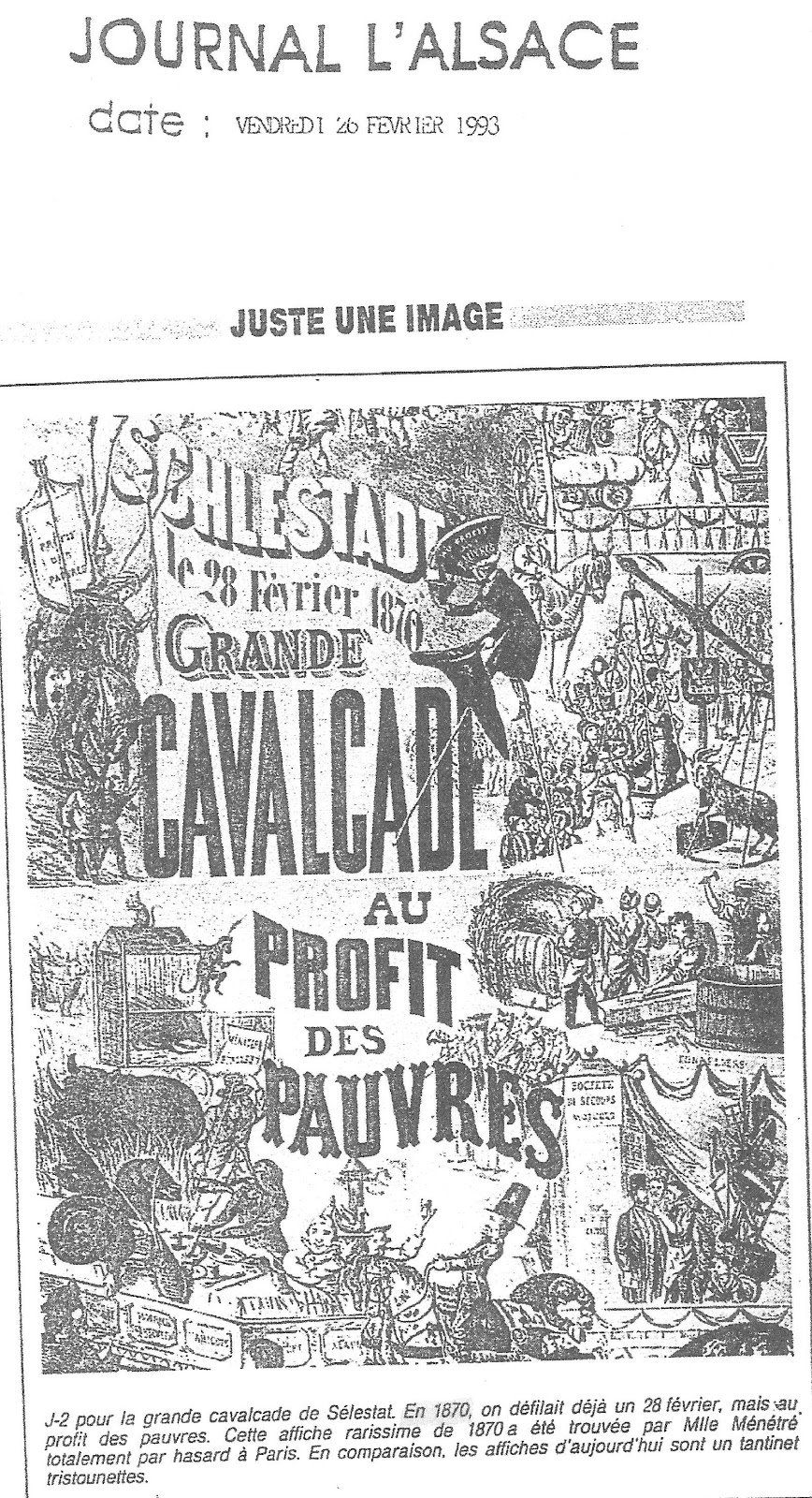 En remerciement, les patrons bouchers accordèrent à partir de ce moment là, l’après-midi du Mardi Gras à leurs apprentis afin qu’ils puissent récolter un peu d’argent et faire la fête. A cette occasion, ils sonnaient les cloches de l’église St Georges et ainsi tous les ans jusque dans les années 1960. Le carnaval était d’ailleurs fêté par la population, notables compris, et ce depuis des temps très anciens comme l’atteste l’affiche du carnaval de 1870 !